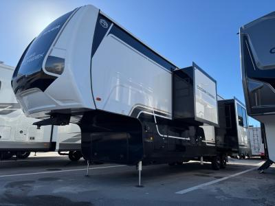 Sleeps 3 Slides 4 Length 41 ft 9 in Ext Width 8 ft 5 in Ext Height 13 ft 3 in Exterior Color Opt. Full Body Paint; Onyx, Sapphire, Opal Hitch Weight 2690 lbs GVWR 18000 lbs Dry Weight 14779 lbs Cargo Capacity 3221 lbs Fresh Water Capacity 75 gals Grey Water Capacity 123 gals Black Water Capacity 82 gals Available Beds King Refrigerator Type 110V Refrigerator Size 20 cu ft Cooktop Burners 3 Shower Size 48" x 30" Number of Awnings 1 Water Heater Type Suburban Tankless TV Info LR 50" Smart TV, BR 32" Smart TV, Ext. 50" TV Awning Info 21' w/ LED Night Lighting Axle Count 2 Shower Type Shower w/Seat Solar Wattage 200 watts Similar Fifth Wheel Floorplans