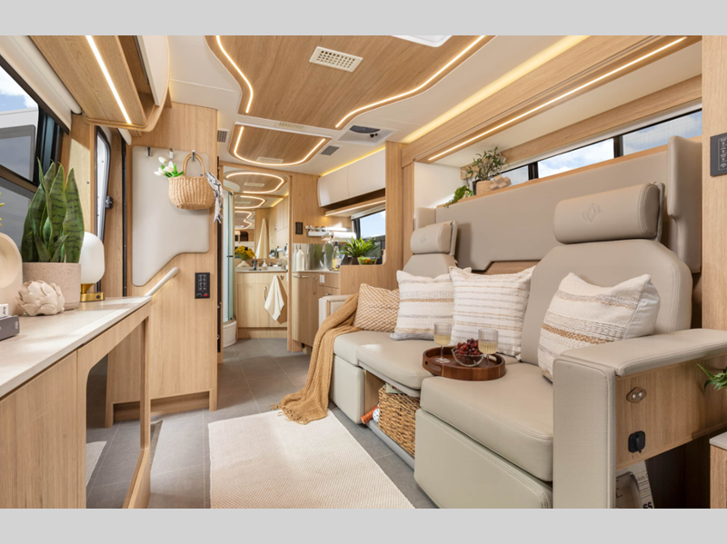 There are versatile floorplans to choose from, all including dry baths, fully equipped kitchens to prepare meals each day, and comfortable sleeping arrangements. Each model sits on the durable and luxurious Mercedes-Benz Sprinter 3500 dual rear wheel chassis for the ultimate driving experience, plus there are power/heated Ultraleather cab seats for even more comfort.