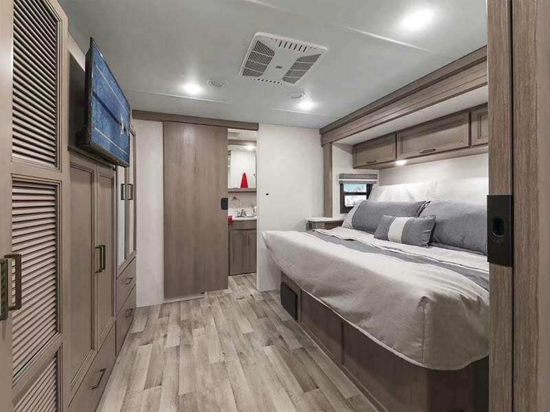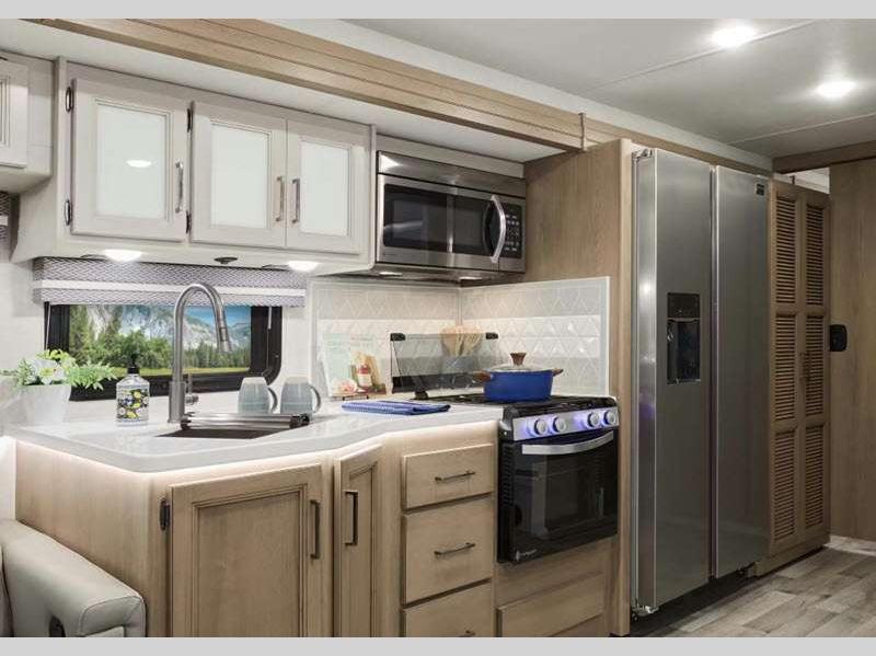 Sleeps 5 Slides 1 Length 30 ft 11 in Ext Width 8 ft 3 in Ext Height 12 ft 2 in Int Height 7 ft Interior Color Hilton Head, Nantucket Blue II Exterior Color Partial Paint; Granite Peak, Silverstone, Full Body Paint; Great Falls, Morning Rain Hitch Weight 8000 lbs GVWR 18000 lbs Fresh Water Capacity 50 gals Grey Water Capacity 40 gals Black Water Capacity 40 gals Tire Size 19.5" Furnace BTU 35000 btu Generator Onan RV QG 4000 Gas Fuel Type Gasoline Engine 7.3L V8 Chassis Ford F-53 Horsepower 335 hp Fuel Capacity 80 gals Wheelbase 190 in Number Of Bunks 1 Available Beds King Torque 468 ft-lb Refrigerator Type Residential Double Door Stainless Cooktop Burners 3 Shower Size 24" x 36" Number of Awnings 1 LP Tank Capacity 88 lbs Water Heater Type Tankless Basement Storage 69 cu. ft. TV Info LR 40" LED Smart TV, BR 32" Smart LED TV, Ext. 32" on Swivel w/ Bluetooth Awning Info 19' Power Patio with Integrated LED Lighting Gross Combined Weight 23000 lbs Shower Type Standard Electrical Service 50 amp Solar Wattage 100 watts Similar Floorplans