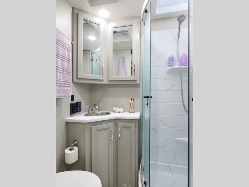 You will be able to tackle any adventure with the Power Stroke 4x4 turbo diesel engine and durable Ford F550 or F600 chassis, depending on the model you choose. There is also a 10,000 lb. or 12,000 lb. hitch to bring the family car along, plus added safety features such, as pre-collision assist and audible lane departure warning. Inside, the residential linoleum throughout will have you feeling right at home, along with Leatherette furniture, solid surface kitchen countertops, and a glass shower door in the bath.