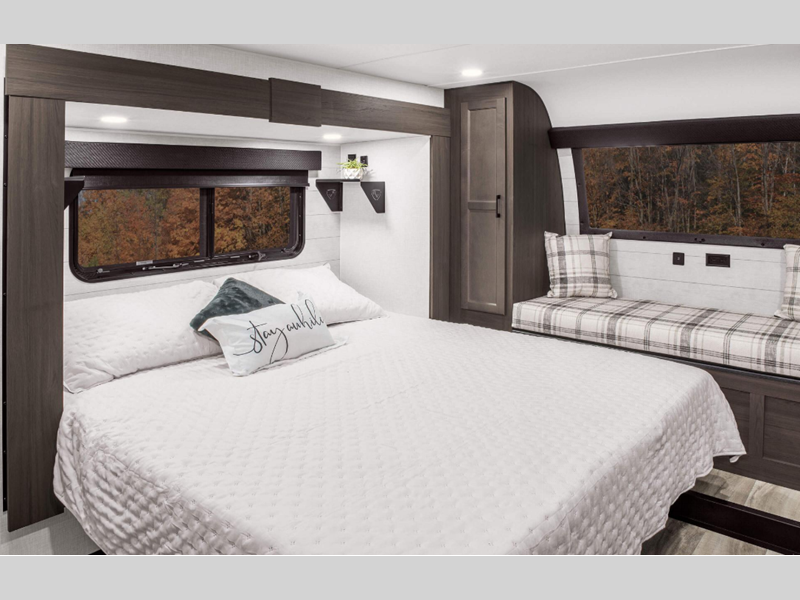 A PVC roof membrane covers protects the top of these units and a heated and enclosed underbelly protects the bottom. The RV airflow A/C system increases the 15,000 BTU air flow by an average of 40% for an improved performance, faster cooling time, and reduction of noise. You will also appreciate the 200W solar panel for off-grid capabilities, and the leveling system will have you set up at camp in no-time!