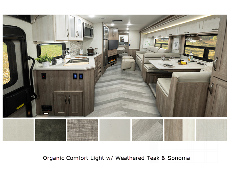 Sleeps 5 Slides 2 Length 35 ft 6 in Ext Width 8 ft 6 in Ext Height 12 ft 1 in Int Height 6 ft 10 in Interior Color Organic Comfort Dark, Organic Comfort Light, Bohemian Oasis Exterior Color Full-Body Paint; Silvermist, Wedgewood ll, Steel Grey, Night Sky Hitch Weight 5000 lbs GVWR 22000 lbs Fresh Water Capacity 75 gals Grey Water Capacity 57 gals Black Water Capacity 48 gals Tire Size 22.5" Furnace BTU 40000 btu Generator 5,500-Watt Cummins Onan Marquis Gold Fuel Type Gas Engine 7.3L V8 Chassis Ford F-53 Fuel Capacity 80 gals Wheelbase 228 in Available Beds King Refrigerator Type Stainless Steel Residential with Ice Maker and Water Dispenser Convection Cooking Yes Cooktop Burners 2 Shower Size 34" x 34" Number of Awnings 1 Axle Weight Front 8000 lbs Axle Weight Rear 15000 lbs LP Tank Capacity 76.14 lbs Water Heater Capacity 10 gal Water Heater Type 110V/LP AC BTU 28500 btu Basement Storage 122 cu. ft. TV Info LR 50" HDTV, BR 32" HDTV, Ext. 32" HDTV Awning Info 19' Power w/LED Lighting Washer/Dryer Available Yes Gross Combined Weight 26000 lbs Shower Type Radius Electrical Service 50 amp Similar Floorplans